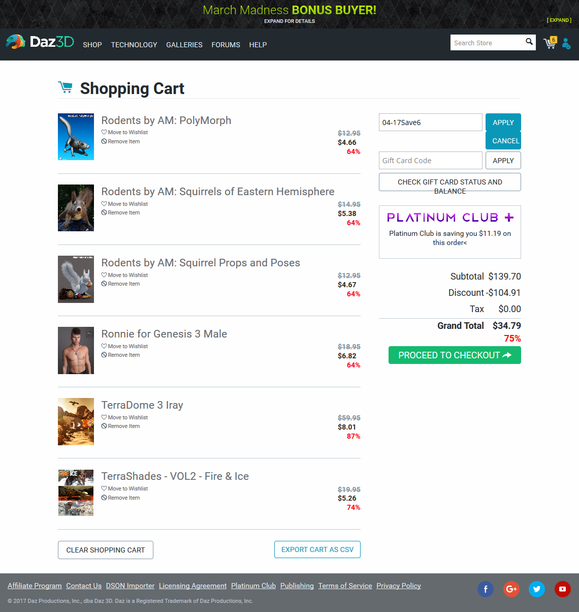 It looks like this MIGHT be the cheapest way to get the new Daz Pro Bundle. Have the Bonus Buyer banner (can be gotten by buying anything that is more than zero dollars), then add the pro bundle and a really cheap item from one of the Featured Artists catalogs (preferably an OLD one or a RuntimeDNA item) that way it triggers the extra discount. Then add one of your PC+ coupons.
