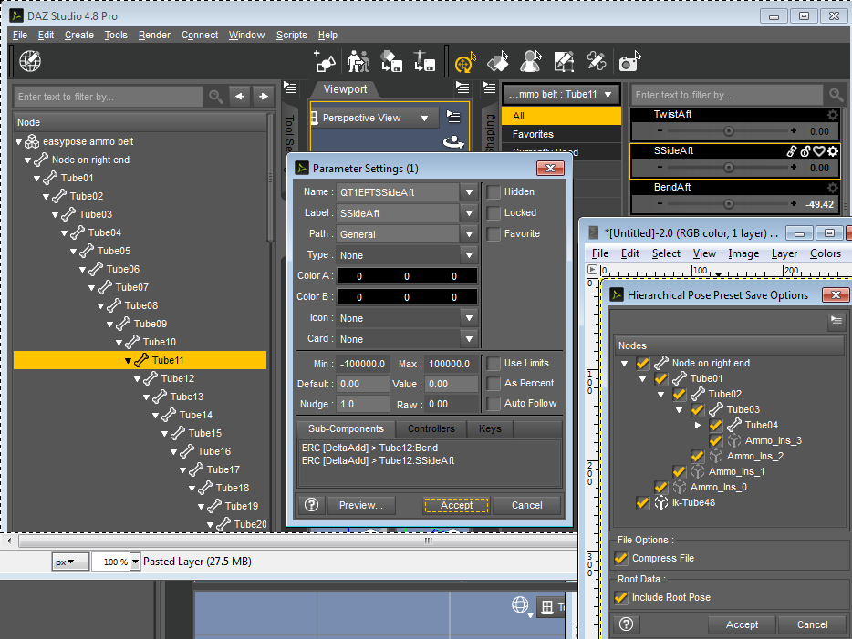 Here's a screenshot of one of the easypose settings, BendAft. Also a screenshot of the save settings, partly expanded into a few nodes (presumably all nodes are selected).