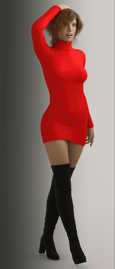TIP: Use Camdyn on Gen3F for a gal with natural looking brows (meaning not penciled) She's also a DO and is already 58% off. I'm rendering her for you, and I put her in H&C Sweater Dress, which frankly when I use it will be as a shirt, with leggings or with pants. (Got that on extreme sale, it's way too short for me to buy otherwise.) It has black boots that can be used for other outfits.(There's black boots in Fast Grab too, before you grab those, see if you have this outfit then compare the boots.)