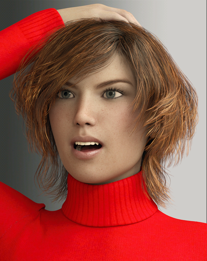 This is that Wildling Hair on Senna for Monique 7, who I don't have so she is on Genesis 3 Female. I like her better than the promos showing her on Monique! She IS a Daz Original btw. Her teeth look very natural, but too white, so try a bit of whitish blue in the base color (in Surface tab) The Wildling Hair I'm not sure about, will have to see that under different lights. It's not as thin as I thought it would be, but doesn't quite have enough sleekness in the strands for my tastes, a bit coarse out of the box. I do actually like that it's messy, but not a tangled messy. Morphs are okay, not extensive by any means.