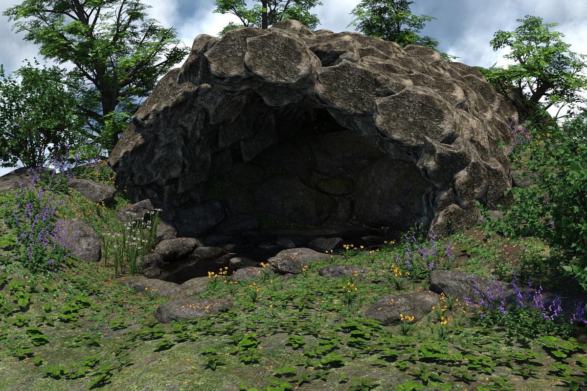 Another combo. This is two products I got in December: another set by Andrey Pestryakov/Peanterra called Water Spring combined with EcoManiac3D's Formations for Rock Collection. This scene shows about how they load, with Water Spring moved slightly and the rock formation lowered in Y scale and expanded in X scale (the original opening was too round for my liking). I used the DeepCaveC5K prop as it had a stone color similar to Water Spring's. The 5K is the low resolution version; there's also a higher resolution 50K prop which really slowed movement in the viewport. Sky is from Skies of iRadiance. I put a 100K ghost light inside the cave to provide reflected light and avoid a black hole.