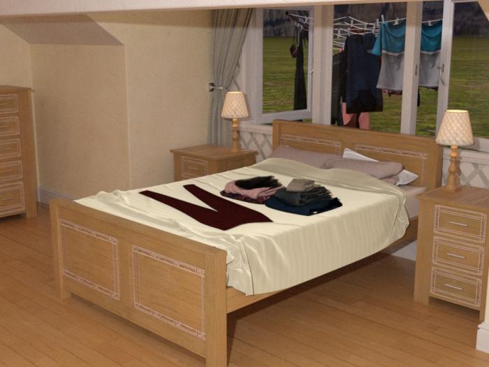 The laundry shows up in the render in two spots, on the bed and outside the window. The clothes hanging outside load as one prop but each piece of clothing is its own item so you can hide or replace it if you'd like. There's a variety of individual props: stacks of folded female and male clothing (3 each), individual folded clothing, and hanging clothes set up to either hang from a line or a hook. I show a couple of stacks on the bed and one hanging item laid out at the foot of the bed. Hanging clothes have wind and sometimes other adjustment morphs. You also get a laundry basket and clothes pins. Comes with IRay and 3DL materials. I thought it was a versatile product useful for scenes of everyday life.