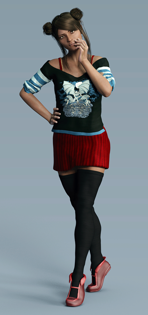 The Patty Clothes are fun with all the different materials. I don't care for the end of the sleeves, I had to literally go into Scene tab and use the Bend Forearm and scale that up on the sweater (the outside piece you see) to avoid the pokethrough, as the morphs adjusted past the limits still didn't work enough. So watch the sleeves. It has nice morphs for the skirt, to help it raise up and down and fit better. A very fun outfit! The second hair is Dax Hair, which we've featured many times previously.