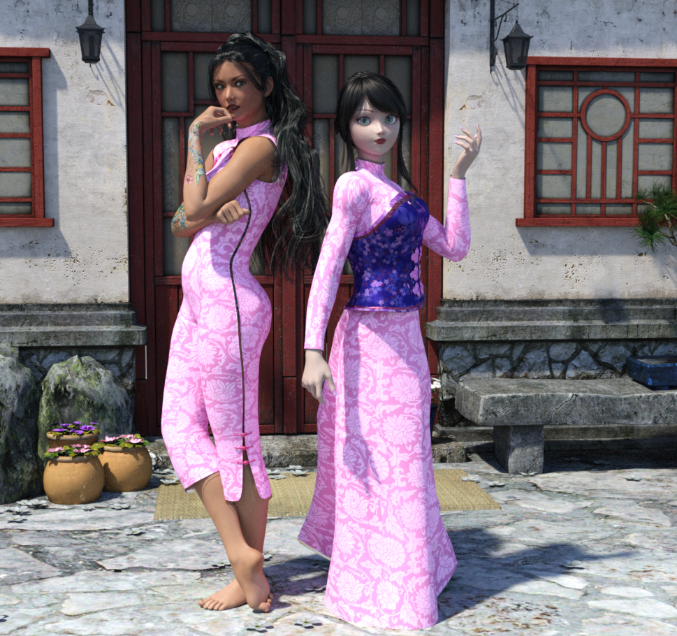 I also used DA Real World Lighting, which I've never tried. So if the lighting looks a little odd, that's why. I'm also still trying to find the right Iray shaders for Aiko 3. That's Stonemason's Streets of Asia 2 behind them with no additional shaders. It renders great!