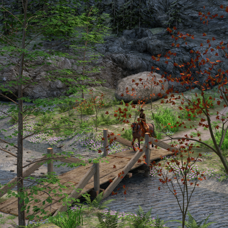 I believe this set was created using Ultrascatter. The large trees have proxies in the viewport, so you can't tell where the vegetation is until you render. I had to move the horse and rider several times to get them clear of leaves. Anyone know if there is a way to turn vegetation on before rendering?