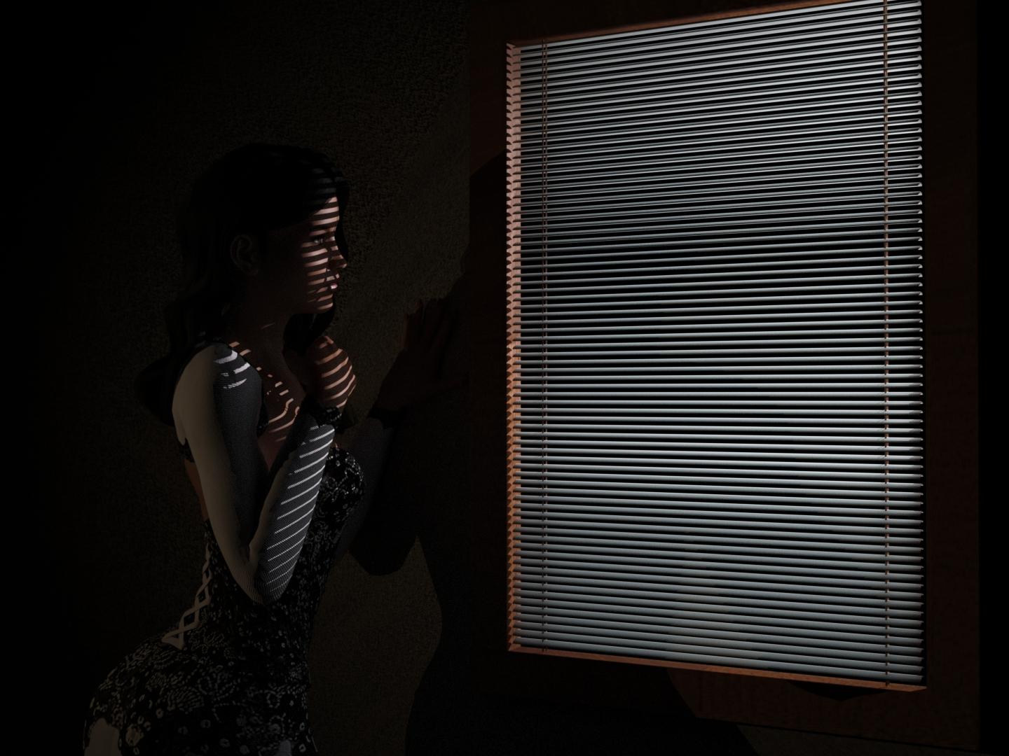 A wall, a frame, a venetian blind. Spotlight outside, femme fatale inside (with a weak spot with her).