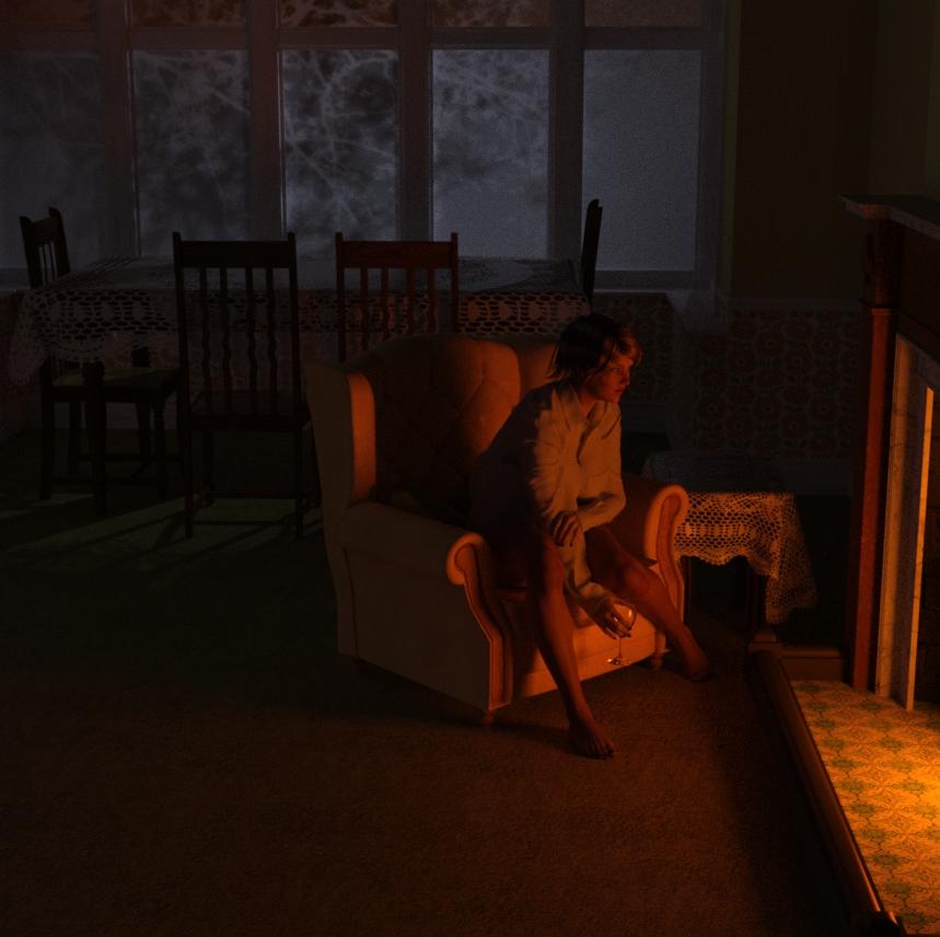Only thing I would suggest at the moment is changing the camera view slightly or the position of the figure in the chair so that she isn't quite so central in the image. Otherwise, the light is very beautiful, the contrast between cool colour outside and warm colour inside is lovely. Maybe you could accentuate that even more?