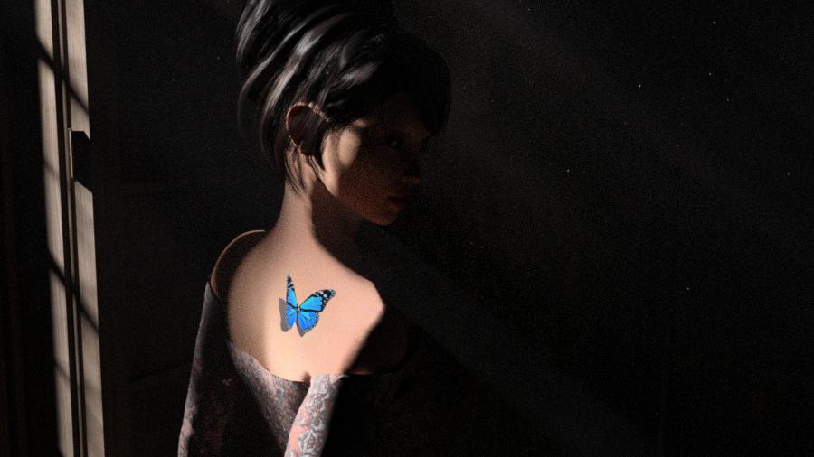 Thanks Shortcut. I did a quick and easy touch-up on that wrinkle in Photoshop. (This is a draft, after all...) Looks like if I'm careful next time, I may be able to make it disappear in post. Would like to know what's up in Studio, though. I used Iray optimized skin for G2F. Seems this wrinkle is right on a seam between the back and arm, which is right where I put that butterfly tattoo. I may have bungled it when I put that on.