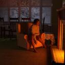 I like the contrast between the cold weather outside and the warm colors from the fire. She seemed a little sad, but I would rather give her a relaxed atmosphere.