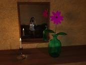 Is your figure in the mirror using a camera or a camcorder? She would either need more lighting or a flash to capture the candle and flower. If she is using a flash it would be reflected by the mirror. This is turning into a challenging scene. Having her stand slightly angled instead of square to the mirror might work...I'm not sure.