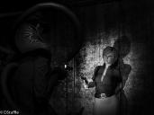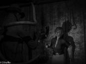 I like this one a lot :-) and the whole noir look. If I could suggest ... see attached image. Sorry about editing your image, personally I would take the highlight off the foreground figure's back and head and keep it shadowy with enough detail to see what's going on while keeping the attention squarely on the other figure in that spotlight to add some creepiness to the scene by not showing everything so brightly.
