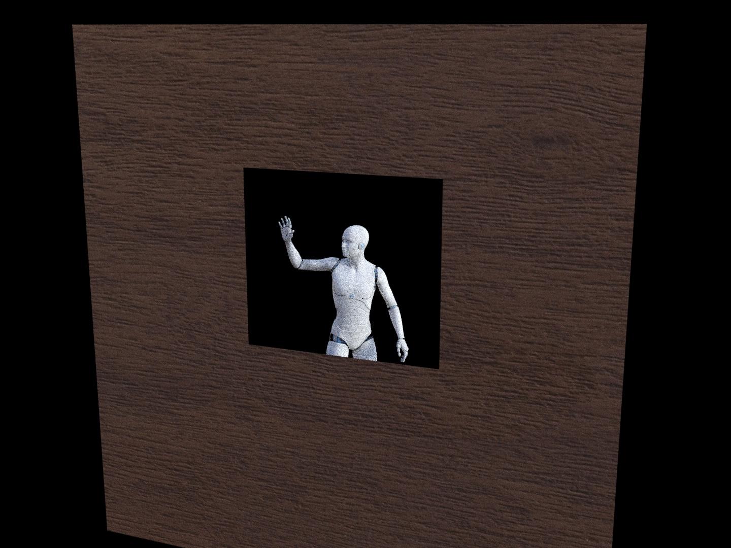 Then you can surface the rest of the wall however you want, and in your case, have the window poke through the hole (which you'd make to fit the window).  Here's a quick test render to show it works (I just surfaced it with a default wood surface and stuck a figure behind looking through).