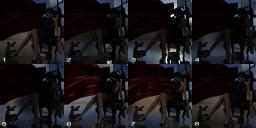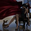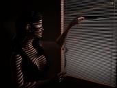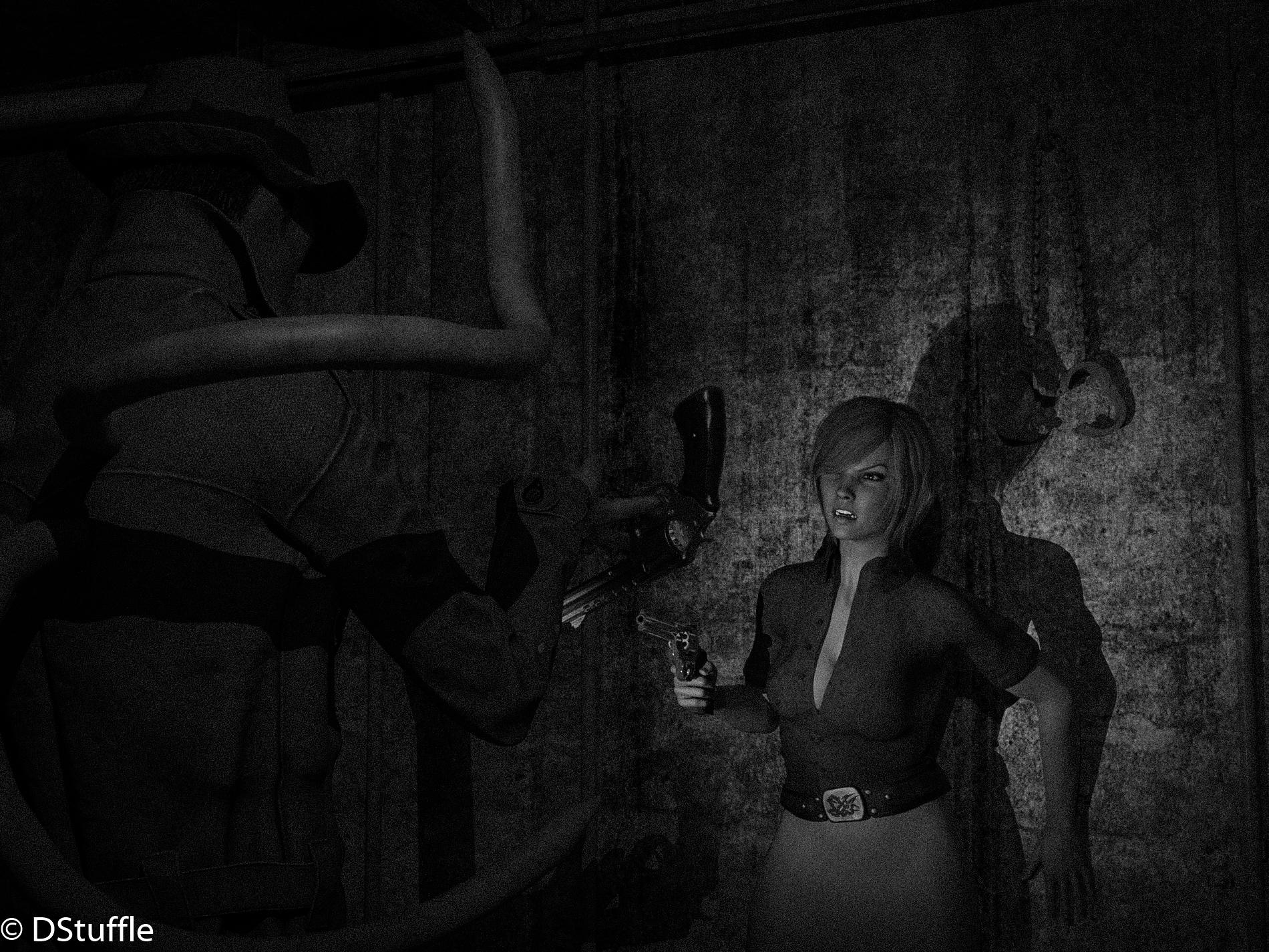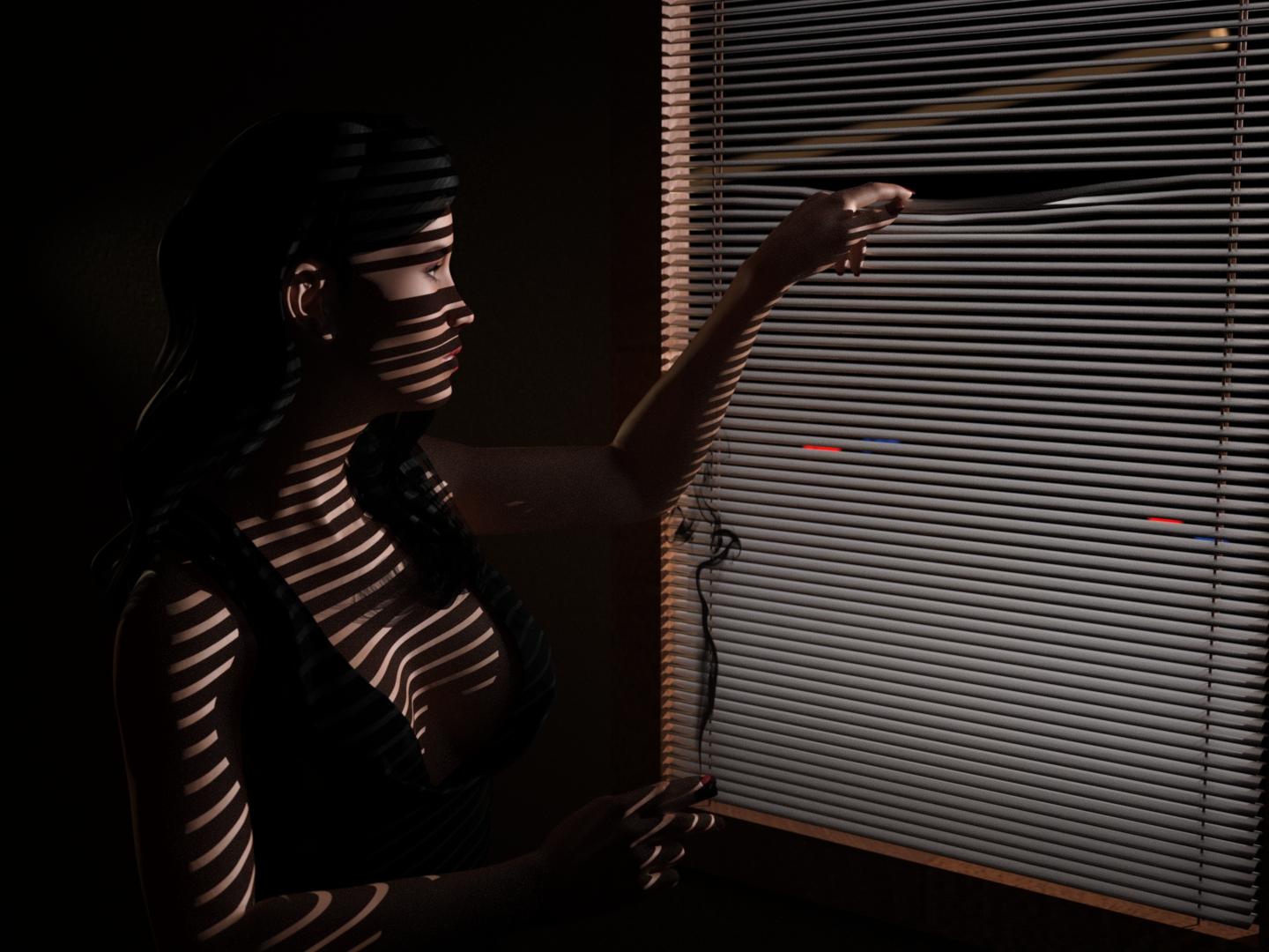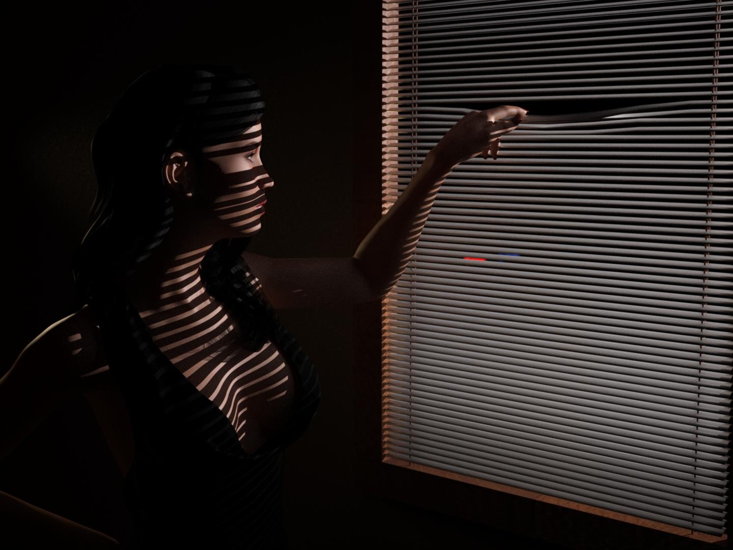 Back home and was able to tidy up and render my WIP on the femme fatale with blinds...She figured out how to bend the blinds to take a look outside, and it's not looking good.