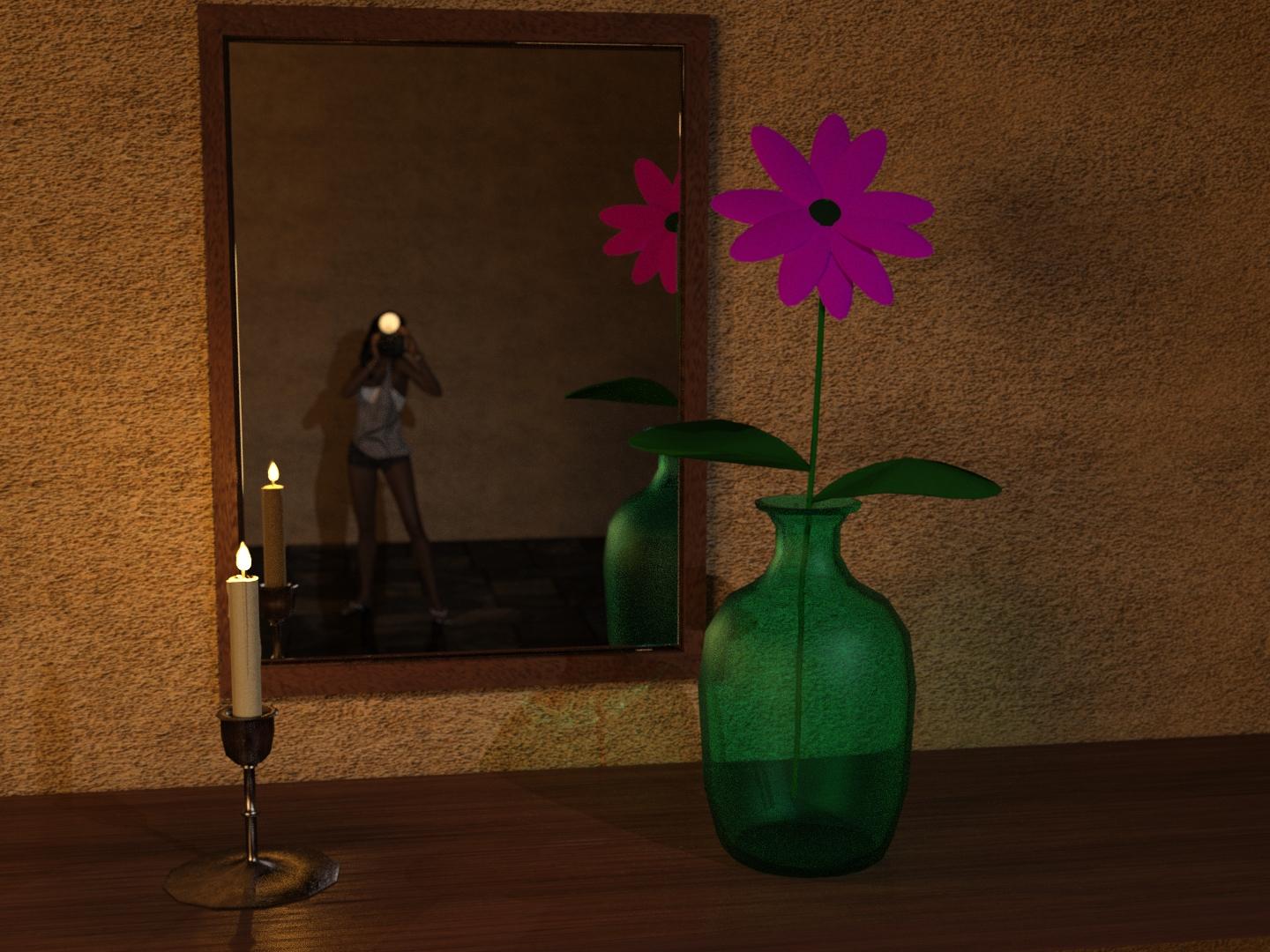 The attached image is an experiment in lighting, mirroring. and getting creative with props. After all it is a pretend world at least for me that I can get creative in.