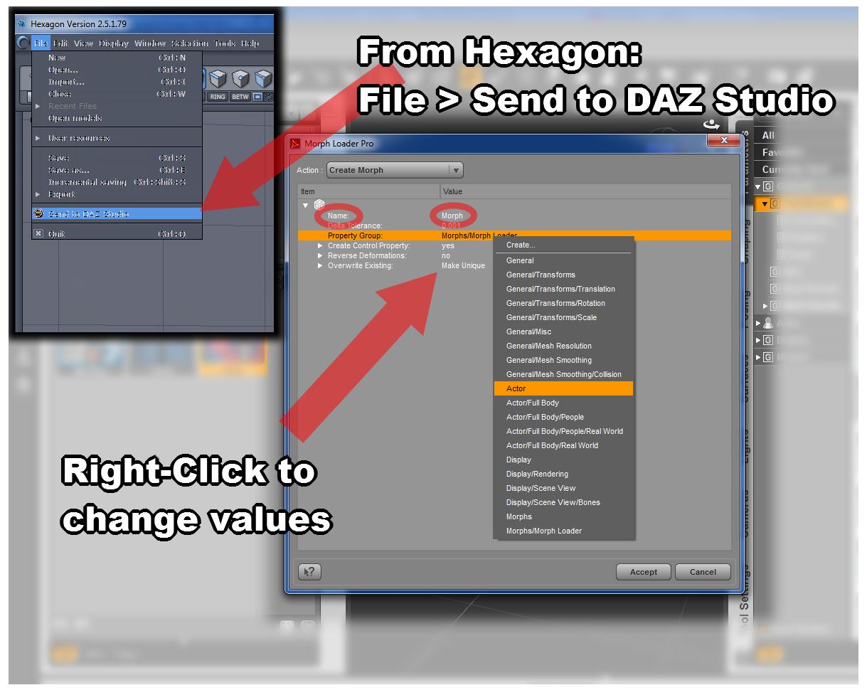 This image shows sending back to DS from Hexagon, and that we Right-Click values in the right column of Morph Loader Pro to bring up the menu to change values.