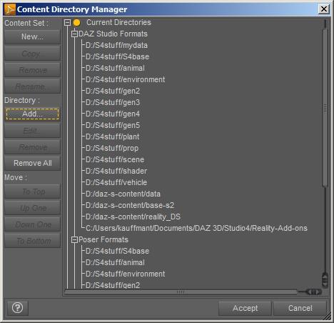 One other item. That 'mydata' folder at the top of the DAZ Studio directory list - Studio stores scene data and other such in the data folder of the FIRST studio format folder in the list - so I set that one up specifically for the scenes to make backups easier.