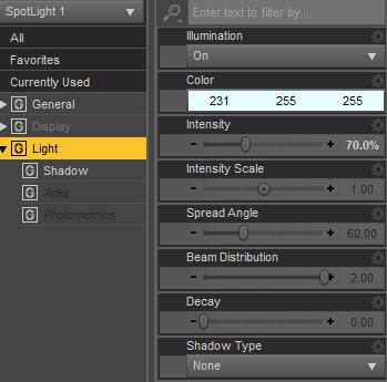 17.  Adjust the settings.  Add a color tint to the light, adjust the intensity.  Leave the Shadow Type as None, or it will add some strange shadows.