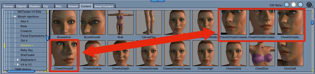 This is an image that I had on hand. It's for V4's Facial Dimple morphs, but the principle is the same