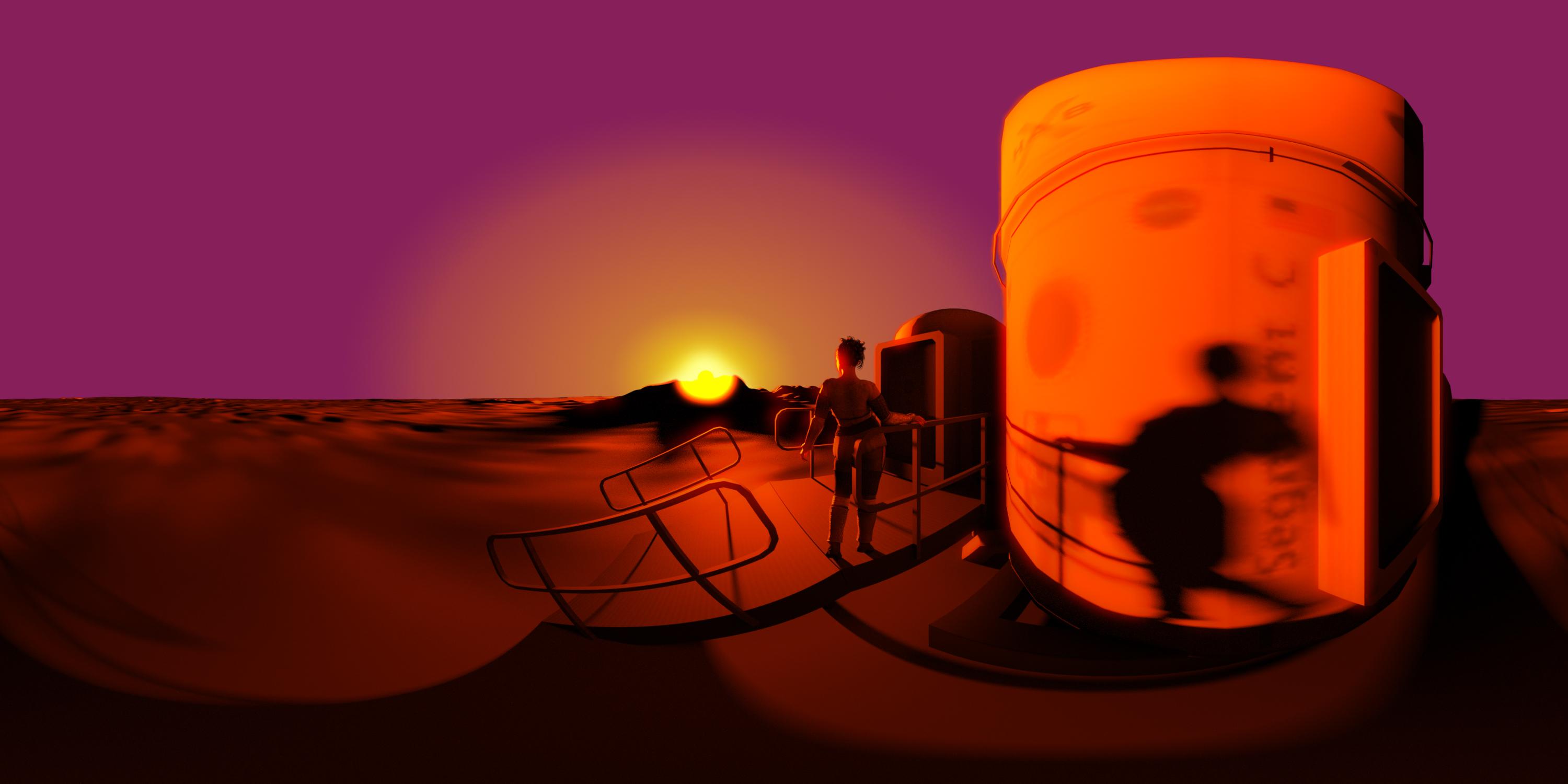 Made another one for you to play with. Did this one on my laptop, so it's only 3000x1500. Still looks pretty good. The sky is all post work. This is a single light source render. The sun is an emissive sphere 300m diameter pumping out 1,000,000,000w at 100% efficency and a temperature of 1100k