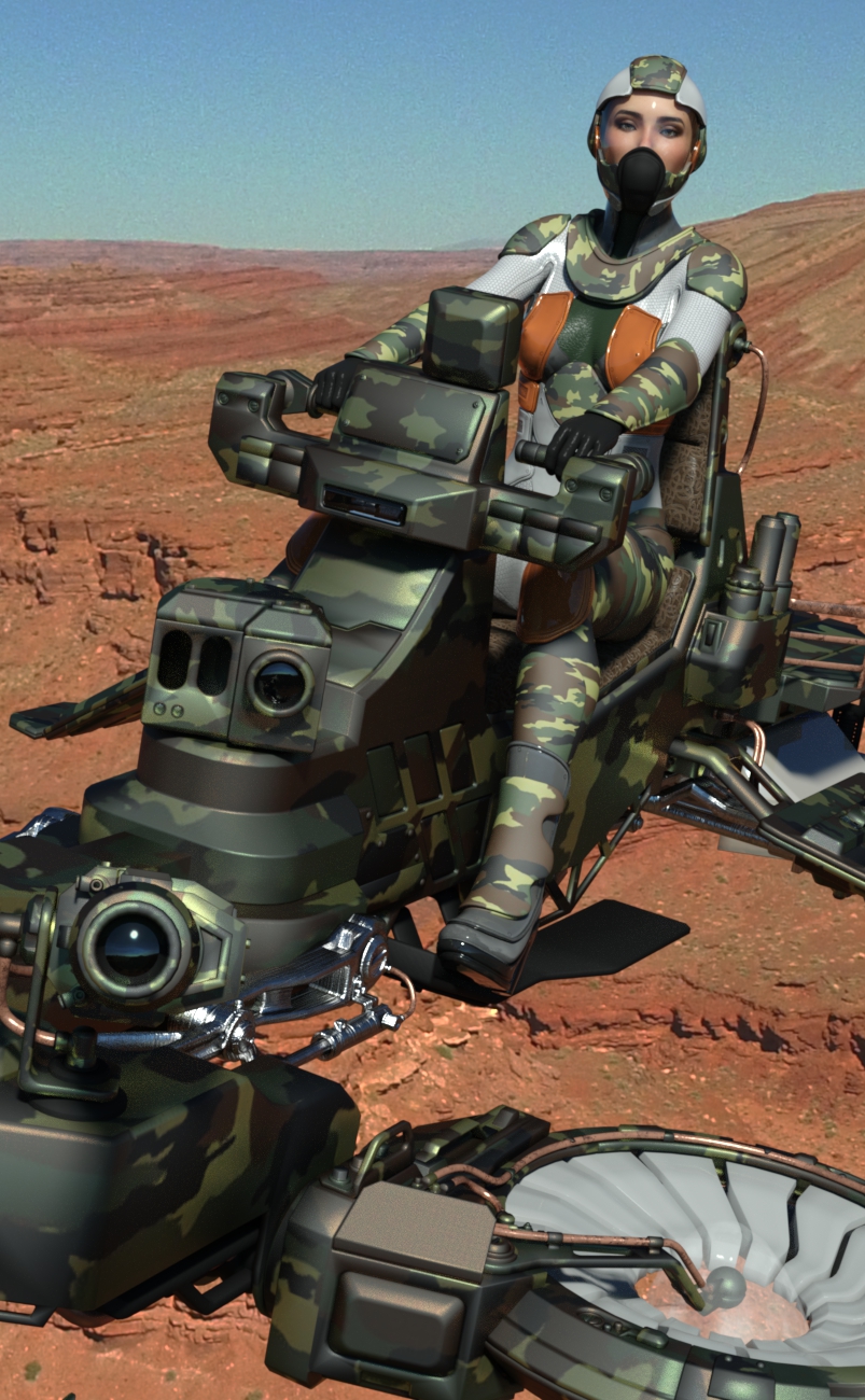 Here’s a mostly Duffy wearing the Andromeda Outfit while riding the Sci-Fi bike over Aerial IBL Wide Open Skies HDRI ‘Mexican Hat’. I didn’t care for the Andromeda or bike’s color schemes, so shaders everywhere. I also hit Duffy’s chest and neck areas with a leather shader to give the impression of a complete space suit or armor.