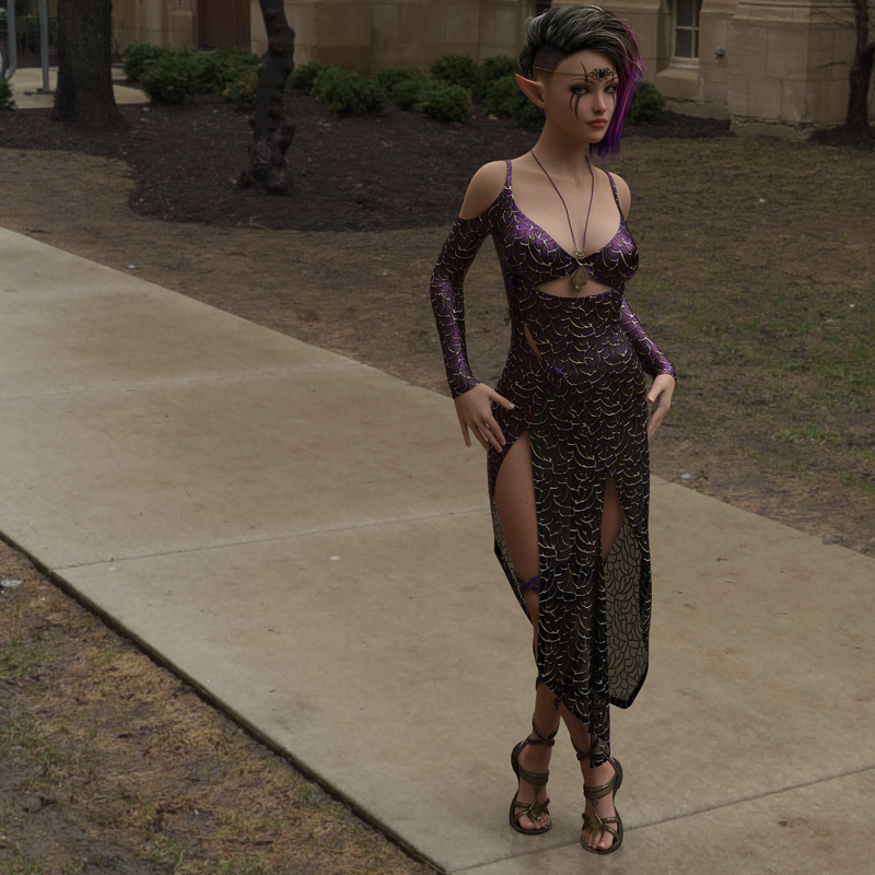 Alifi G8F from Freja at Rendo. Shaved Side Hair ( https://www.daz3d.com/shaved-side-hair-for-genesis-3-and-8-females ), wild nettle dress and textures ( https://www.daz3d.com/dforce-wild-nettle-outfit-for-genesis-8-female-s , https://www.daz3d.com/dforce-wild-nettle-outfit-textures ), rain city HDRI, 8K ( https://www.daz3d.com/iradiance-pro-series-16k-hdris--rain-city-chicago ). No other lights, tone mapping, or post.