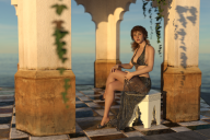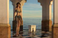 Emma (https://www.daz3d.com/emma-for-genesis-3--8-female) is enjoying Crescent Cove (https://www.daz3d.com/crescent-cove) at Sunset.