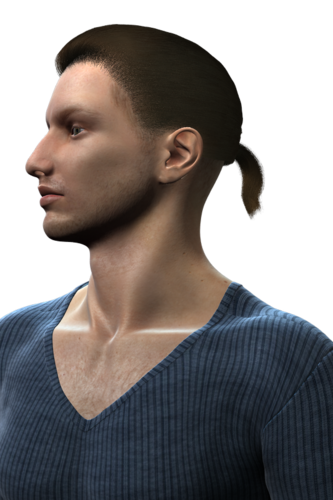 I finally got a semi-decent render, but I'm not 100% happy with the hairline (the individual hairs look too thick). I'll keep tweaking...