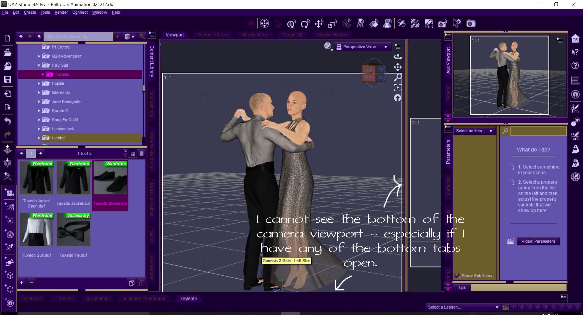 This was a passable situation until yesterday when I started working on an animation sequence. When pulling up the timeline/animate/keymate/etc tabs, it cuts further into my viewport space and it makes it very difficult to see and adjust my figures. I either have to rely entirely on the Aux Viewport, which is too small to catch the details I need to, or I have to close down the animation tabs - but even then I'm not able to see the entire scene because of the previous blocked view issue.