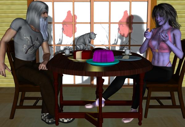 Anyhow, my character Cassy, back home on the planet she was raised on, having tea and snacks with her mentor, old man Smoke Bailey. He's one of those old guys who are pretty cool and can still kick ass if need be. Think of him as Obi-Won Kenboi without a stick up his ass.