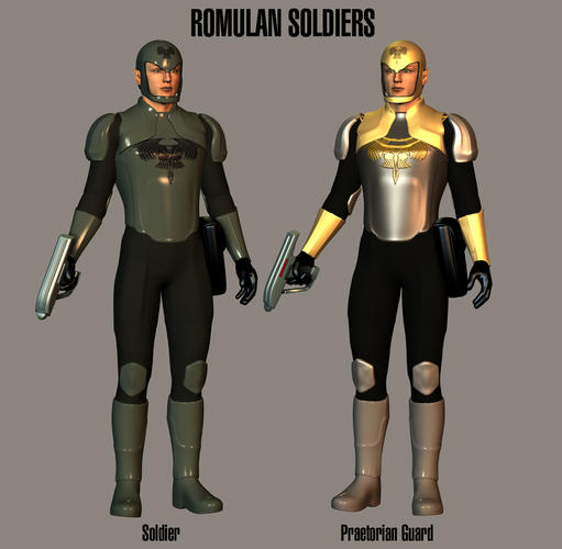 I wanted to go for more of a Roman feel for the soldiers. Trying to do an update of the Roman armor for the Romulans. The helmet was downloaded here (forgive me, but for the life of me, I can't remember who did it). The armor is ice_boy's Geo Suit retextured by me. And, of course, the disruptor is courtesy of Bluto.