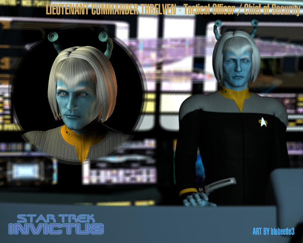 When Starfleet offered Norstrom the command of the U.S.S. Invictus, Threlven was serving aboard the U.S.S. Quasar under the command of Captain Geoffrey Littlefield. By this time, Littlefield was more than happy to transfer Threlven to the Invictus. After much negotiations with Norstrom, Threlven, along with Lt. T'Prae and assorted miscellaneous goods, was transferred to the Invictus.