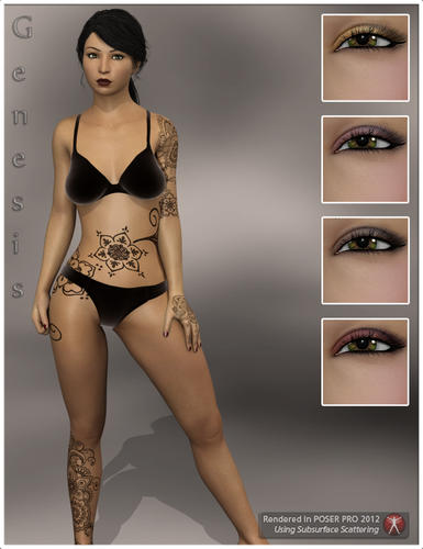 The textures are both based off V4, but extra care was taken to help textures fit better on Genesis (eyebrows, makeup, etc.). Options include 5 eyes, 2 lashes, 9 makeups with options with a separate option for blush or no blush, 10 lip options (two sets of 10; blush and no blush) with settings for glossy or matte, 10 nail options, arm henna, torso tenna, torso tattoo and leg henna options are also included (with settings to use all together or separate). Compatibility includes Poser 6+/D|S 4 materials for V4, D|S 4.0 and D|S 4.5 versions for Genesis and Poser companion files for Genesis with mat poses for all options. Finally, there are Poser 9/2012 SSS materials for both V4 and Genesis as well.