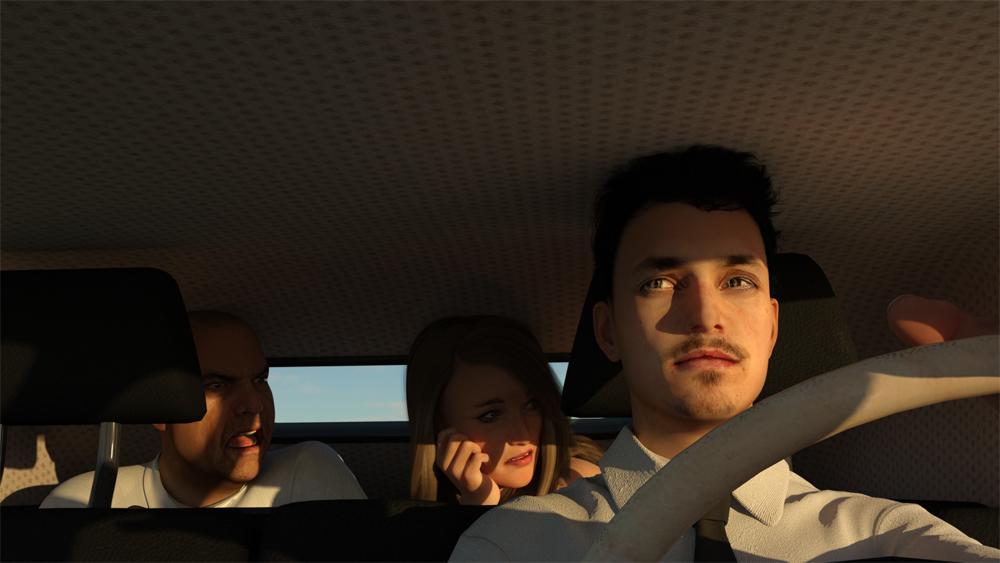 Nice. Driver looks good! It's hard to see the people in the shadows. I recommend ignoring the FaceGen made eye mats and just use your favorite eye mats from another character - I've never once seen the FaceGen eye mats look as good as the Daz PA made eyes. They always look a bit "off".