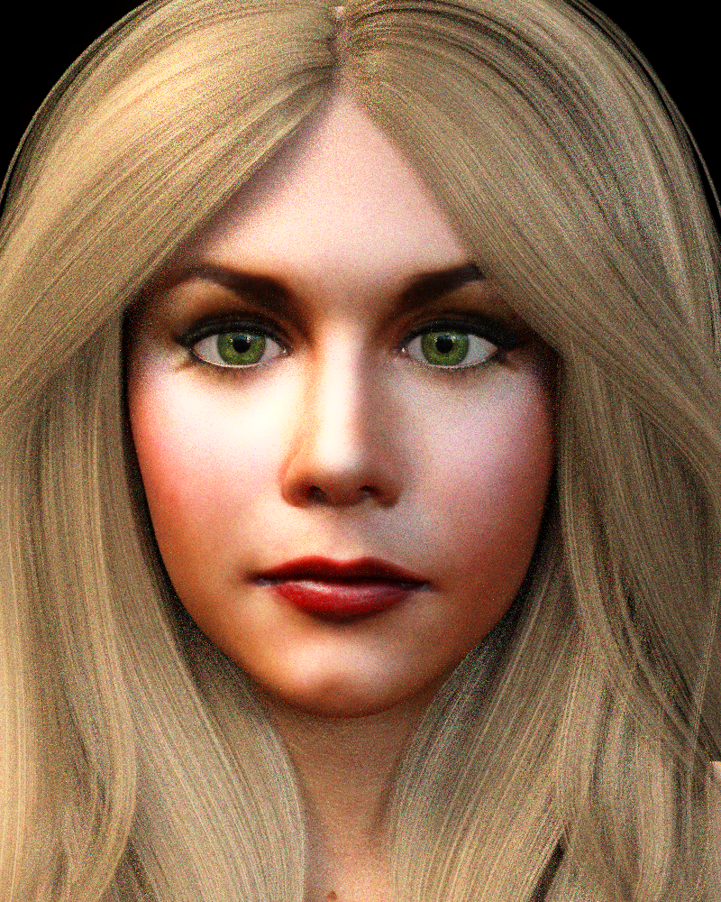 The following renders were done with the G3m default eyes and with the face gen texture eyes using "point at camera" in both renders. Tip: on the camera - don't put it right in the face for close ups. Move it back and use the focal length to zoom in.