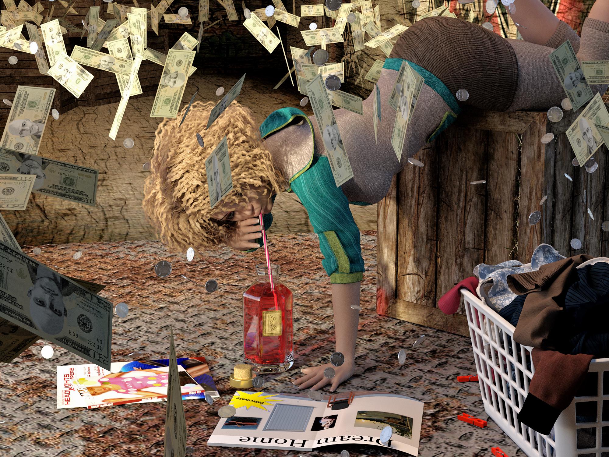 While relaxing in her meagerly furnished box car home, Susie Q sipped Wealth Potion and flipped through Dream Home magazine. Suddenly, it started raining money! She may be able to buy that Collective3d home of her dreams after all.
