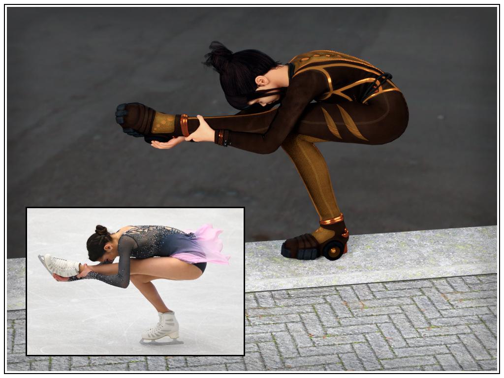 update: I tried to get her left hand as far under her chin as I could, but alas any further and it would start clipping into her neck. I bent her thighs to their fullest extent in order to get her butt closer to her right heel. And Inshifted her right arm back a bit. I like what I have for the most part, but I think I may need to bend her torso just a smidgen to bring her right arm more in line with the reference image, since if I shift the right arm over any more it'll clip through her thigh.