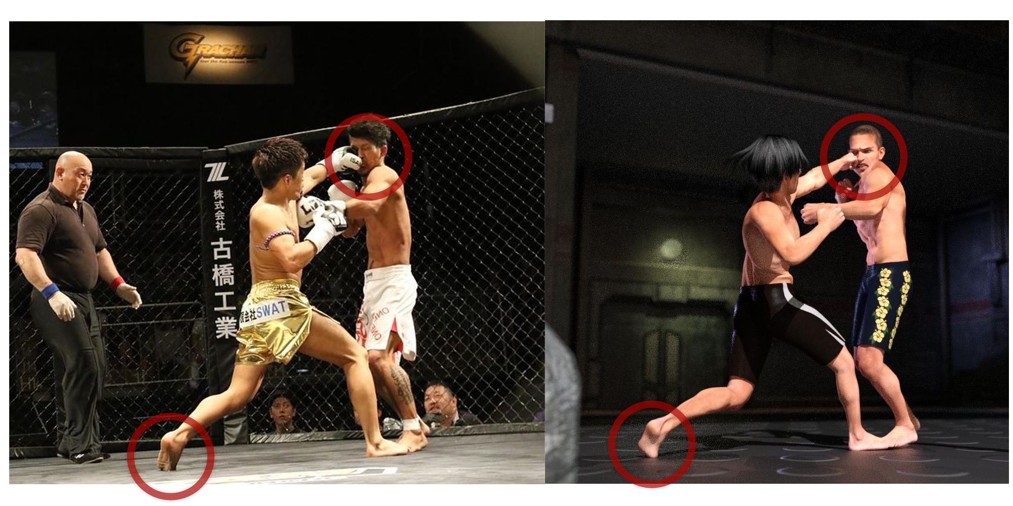 Can you post an image without the shirt on the guy doing the punching?  The one in the foreground?  It is difficult to compare his body position to the reference image.  From what I can see of the legs and arms it looks like you have matched the poses quite well.