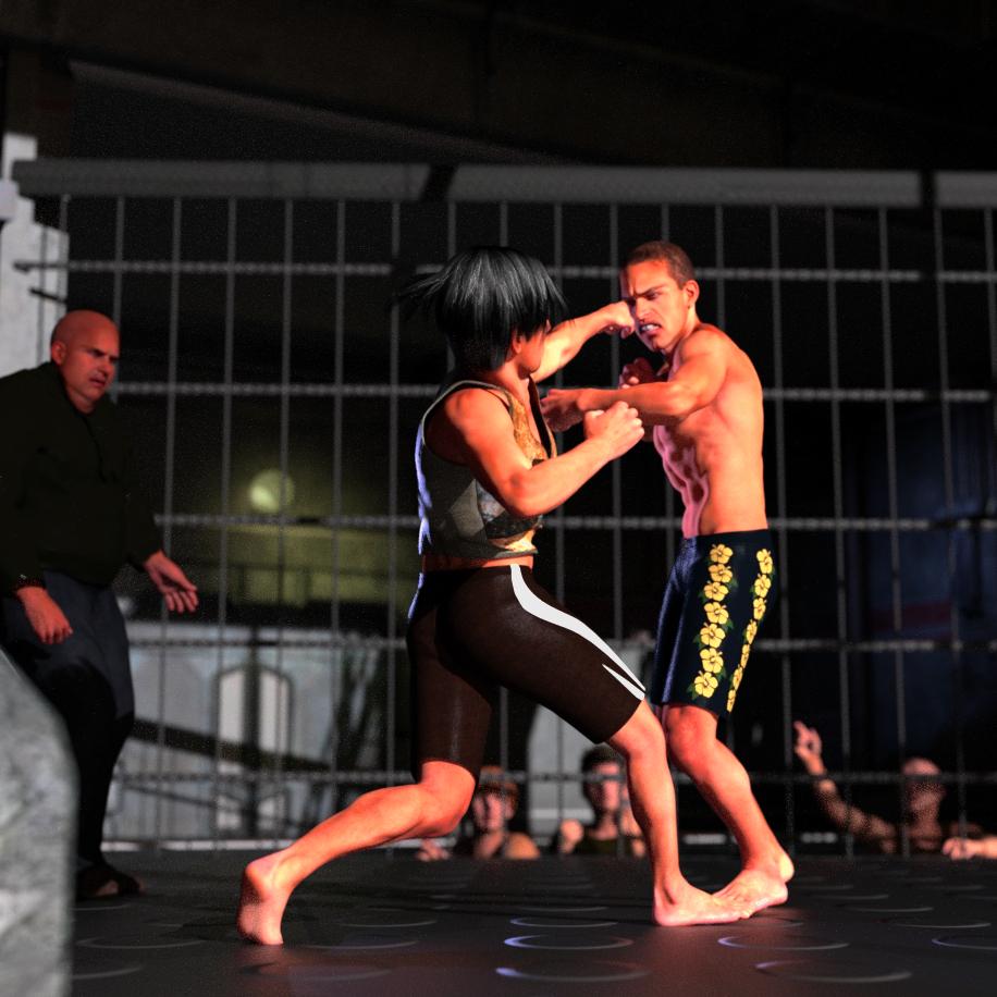 Adjusted the left foot so it's more squared to the floor.  And found the missing neck of the second player.yuk yuk  Thanks Kismet :)  Changed the one guy's shirt to a freebie from the g2male collection. Anyone recognize it? It's from an outfit called voyager but without a collar.    I must have had some extra free time today and took advantage of it by building up the narrative with extra people and a cage-like fighting ring ( an oversized volleyball net).  Can't think of anything else. Anybody?