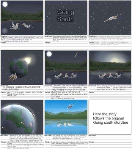 The Alien Visitors is basically a contrived mode for doing a Carrara environment showcase. Ducks, more of a traditional story. Both have particular benefits and challenges. Alien Visitors would be "easier" to pull off. In the Duck story the audience is expected to "care " about what happens to these birds. In the Alien scenarios it is unclear how much connection the viewers are expected to have with the visitors.