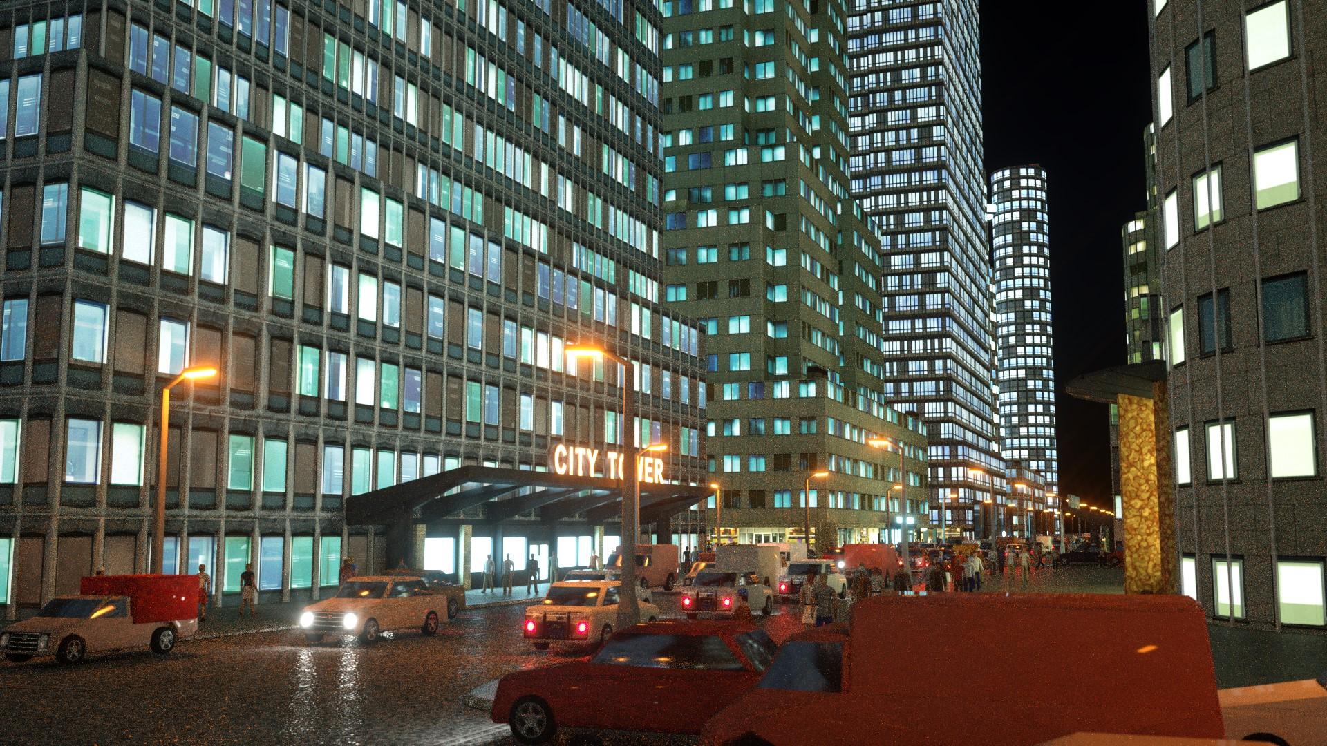 Here's a couple of "poster" renders I did using the day & night hybrid city presets that come with the set.