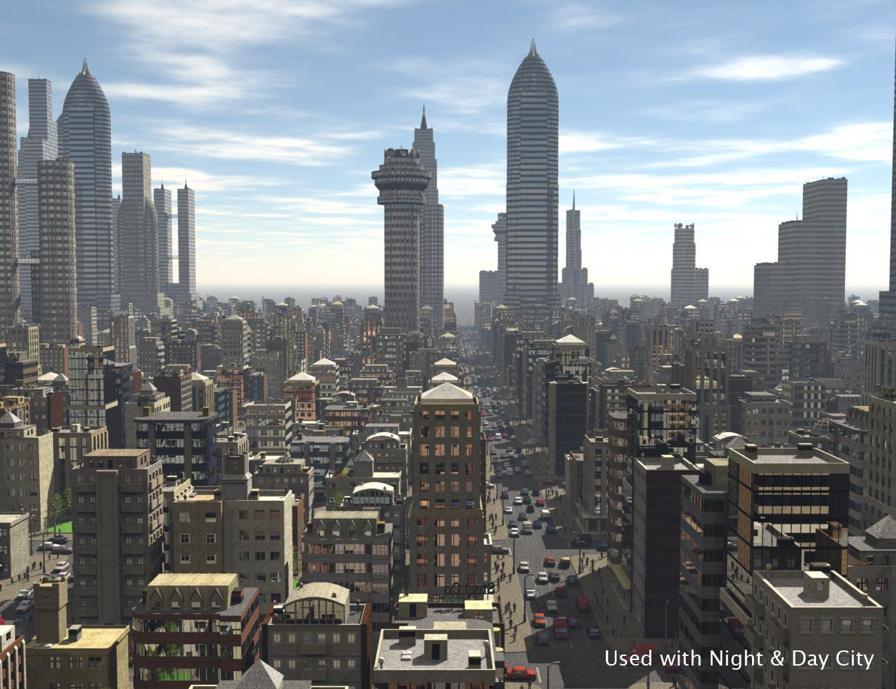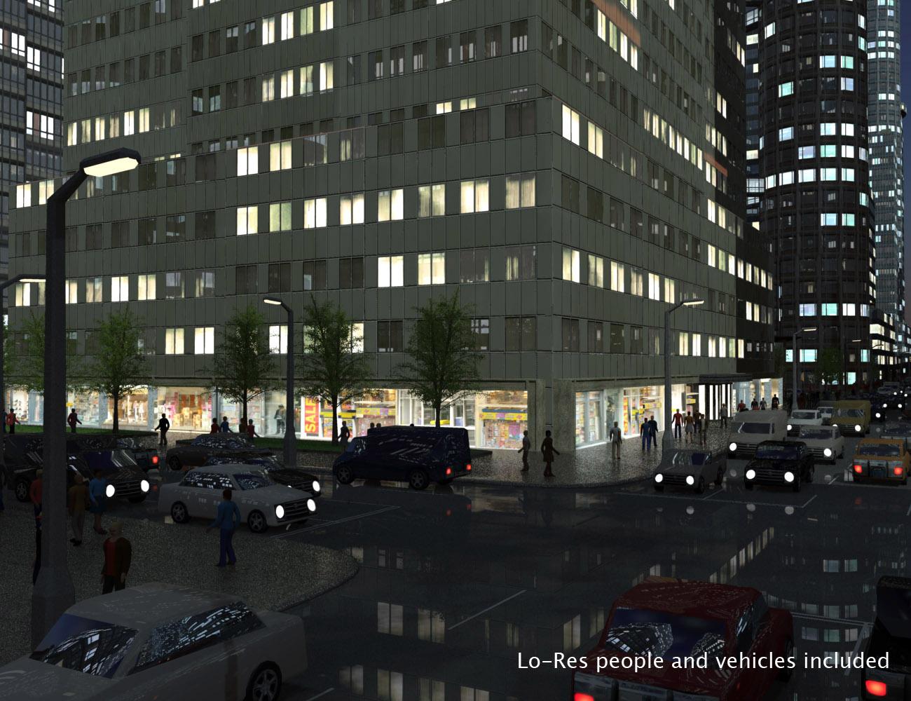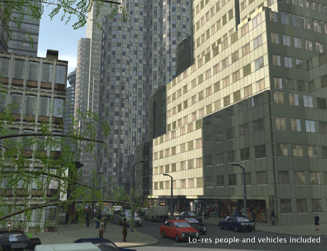...and here are some promo images, the first four using just the Central Business District set and the last two used together with Night & Day City.  These are renders of the sets as distributed, including people, vehicles, trees, etc, nothing extra has been added.