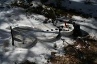 Poor Frosty, or Fred, if you prefer. For months he stood resolutely smiling down upon passersby on the sidewalk below his hilltop perch. Then came the Thaw. And the cold rain. And the very snow upon which he stood melted away. Then came the howling winds and that toppled him onto his back, helpless. Then the return of the cold, freezing him to the ground, where his days passed staring up into the branches of the nearby tree, no one seemingly aware of his plight. A deer passing in the night, oblivious to his predicament, rudely and unceremoniously steps on him as it passes. And so he waits for a return to warmer temperatures, when he can be pried from his frozen bed, to stand once again on his own two feet and smile down on the people passing in the street below. Then he'll get taken apart into pieces, shoved in a cardboard box and stuck in a dark shed for a few months.