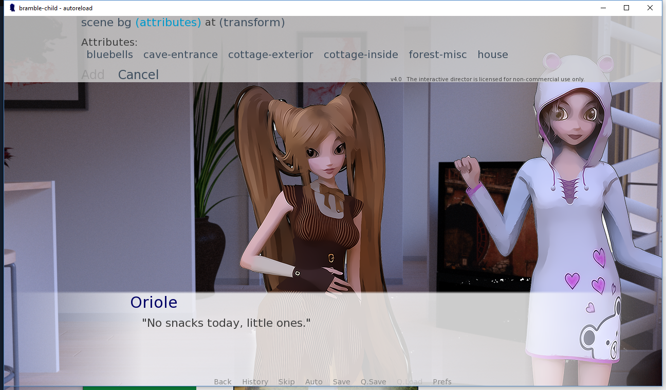 although I did realize that because of the ID, I don't have to commit to a particular pose in advance. If I define them all in the script I can add one to a scene, move it around, reject it and try another without ever quitting. So that's what I'm going to try to do, as soon as I get more of the script itself adapted to Ren'py format.