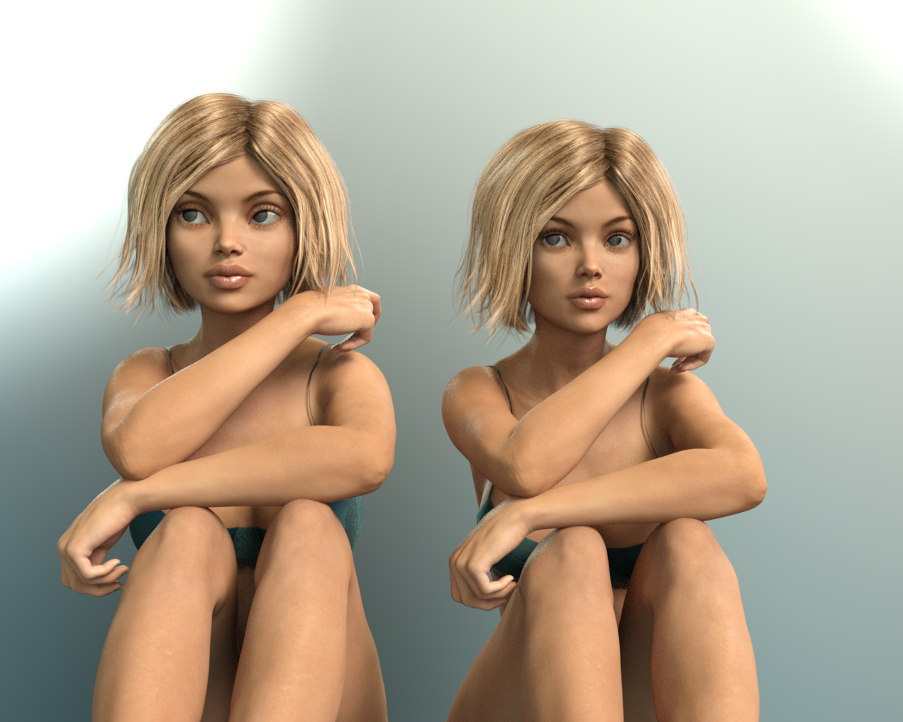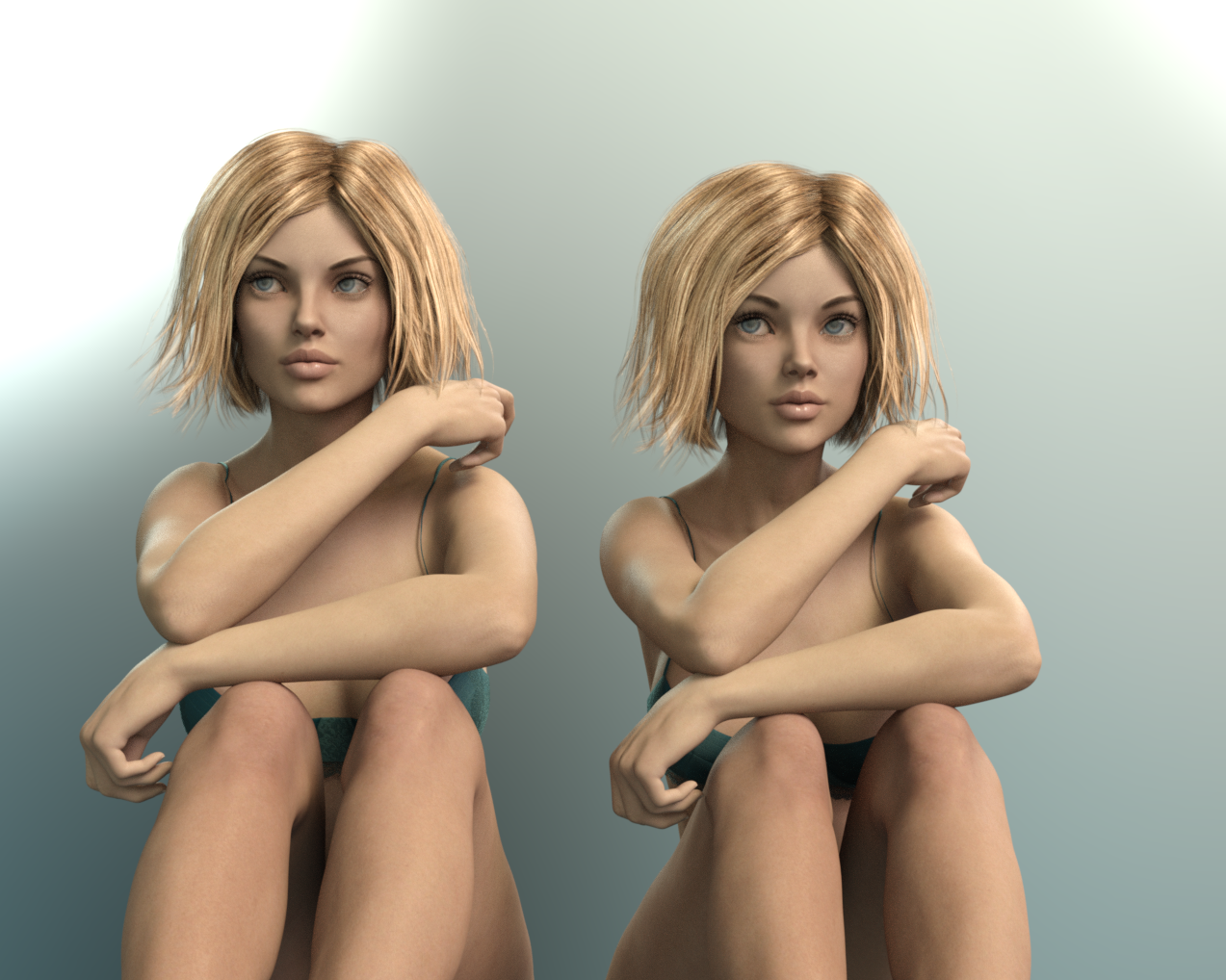 All right, one more cold clinical comparison render since I was doing it myself to take into Photoshop: Mika and her Shaya character. I was a little surprised that Shaya was the exact same size as Mika. I guess Daz has its own 'Fun Size' set now.