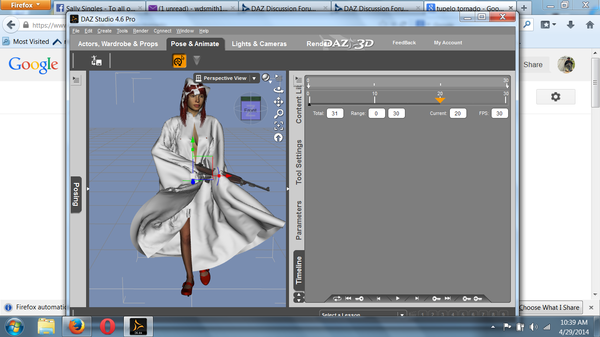 At this point we have two objects in the scene: V4 and the cloak. We have a 'start pose' at frame 0 and and end pose at frame 20.