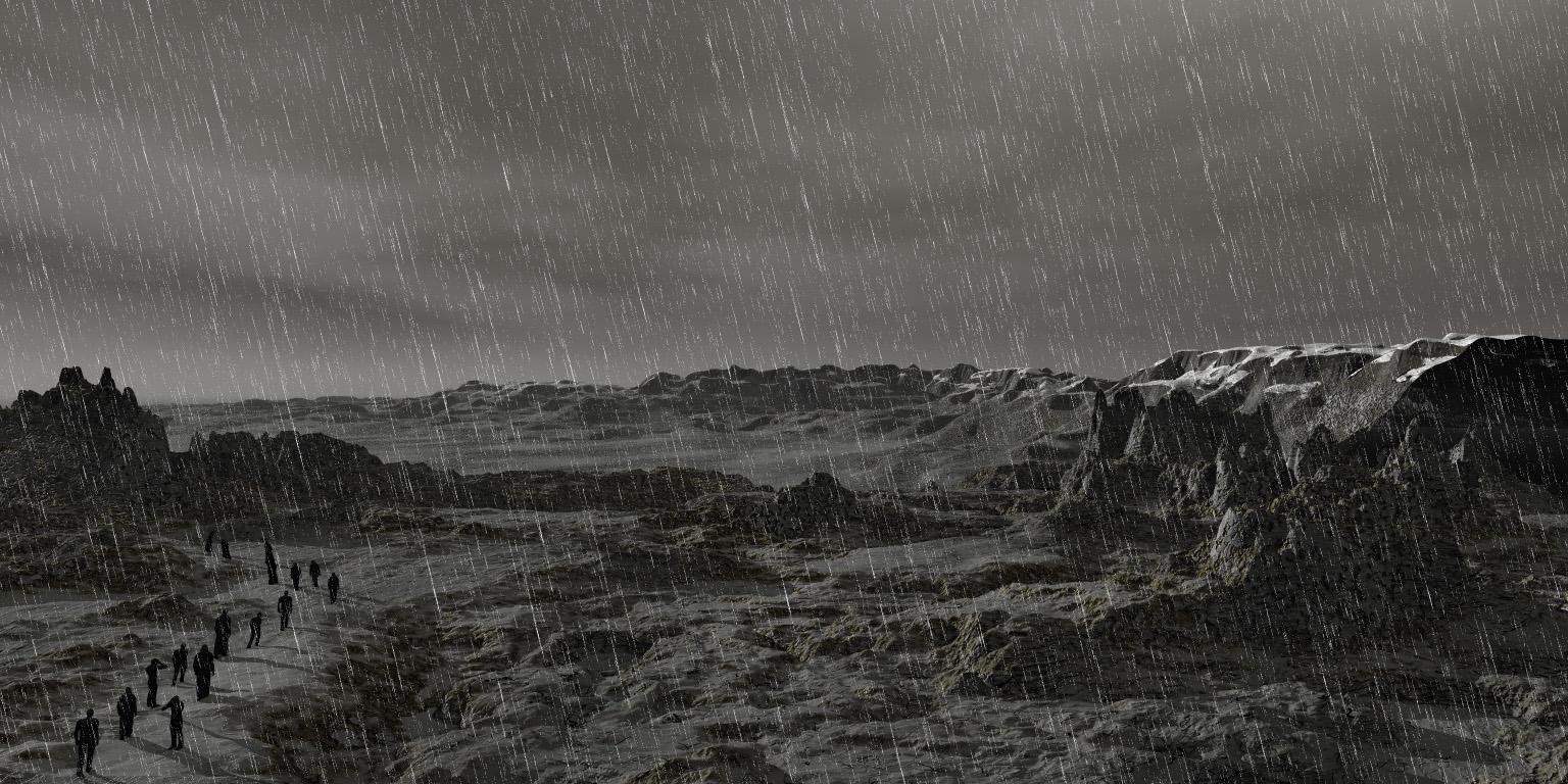 LowRez figures imported from DAZ Studio, sky from Horo's HDRI Enhanced Skies set, rain from Horo & David's Inclement Weather set, the rest built/adapted by me in Bryce. No postwork.