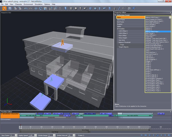 Endorphin uses a little figure, which reacts to physical forces, animation, and poses, and has a bunch of behaviours, like Balance, Jump. stagger, see pic.