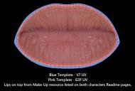 • I thought it would be interesting to note that there is a big difference (about the size of that line) in the lip UVs for V7 and G3F. The Blue UV is for V7, Pink UV is G3. The transparent lips on top is from the makeup resource listed on both the Trish and Jenn readme pages. AND, if one is also creating a custom morph, those merchant resources could be chaos for any character. One could possibly have layers on top of layers of different peoples textures (some for V7, some for G3), saturation levels, tone levels etc. I may be way out in left field, but just an interesting note. :)