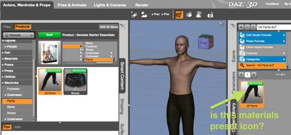 To load the scene subset, just double click on the icon, and to load the material preset, load the JS Pants first, select them in the Scene pane, and double click on the Material Preset icon.