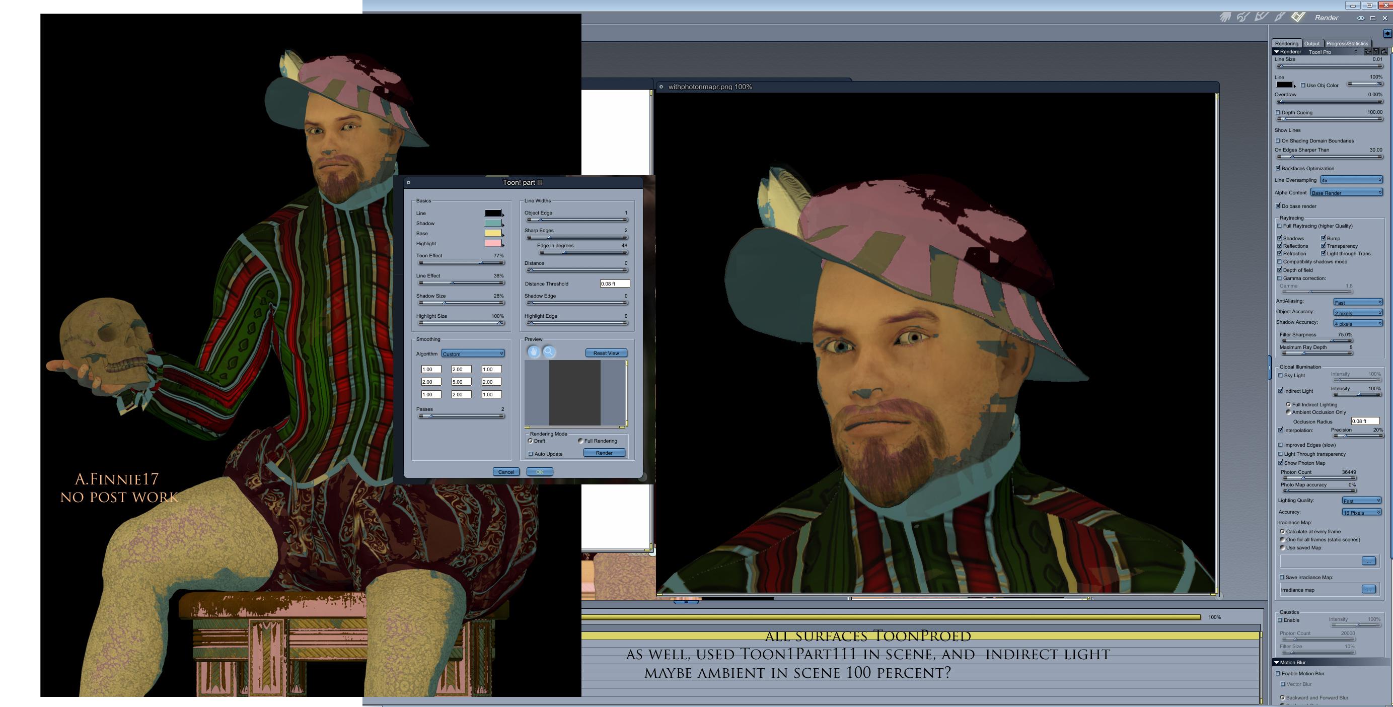 Had a bit of luck today, I sat down with Hamlet and tooned all his shaders (ToonPro) and did a few renders with the Toon1Pro111 engine - and discovered 'show photon map" gives interesting results - see settings for all.